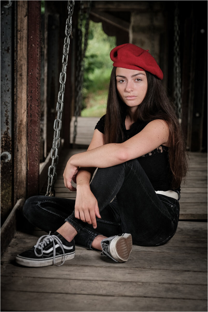J'aime cette opposition entre la modernité de la modèle confronté à la rusticité du décor. La lumière est douce mais avec une pointe d'agressivité qui convient parfaitement. La pose, avec bras et jambes croisés, souligne l'affirmation d'une personnalité.