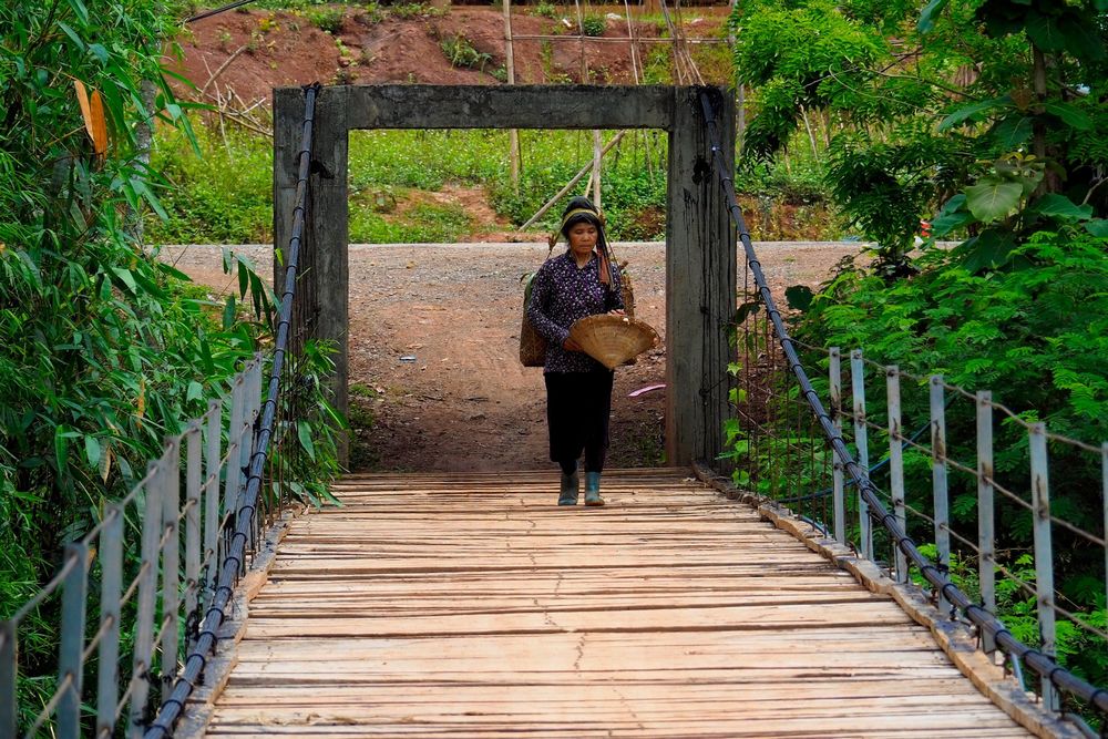 Nord Vietnam , une dame traversant pont de bois