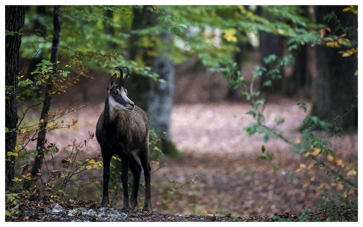 Magnifique prise. La pdc est au mieux pour valoriser l'animal. Son placement est idéal dans l'image. La couleur de sa robe, celle des troncs d'arbres et les feuilles mortes en font une image à l'ambiance harmonieuse.