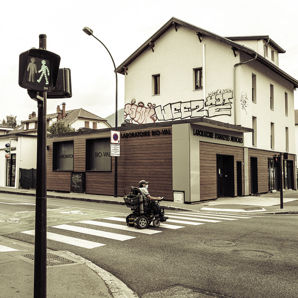 Nos temps modernes permettent de faciliter les déplacements des personnes à mobilité réduite mais ces derniers comme tout un chacun avancent masqués vers les laboratoires d'analyses dans des villes désertées pour cause de pandémie ...