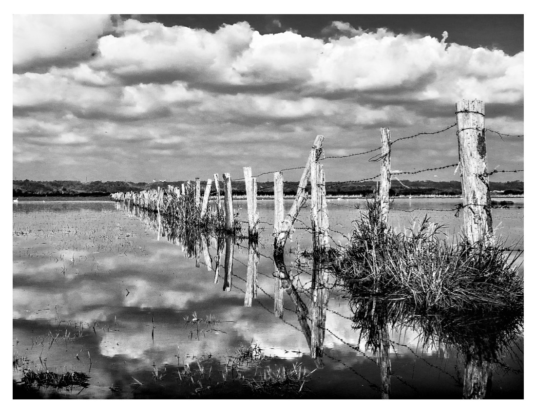 ce ciel en double et la barrière qui partage le paysage en deux