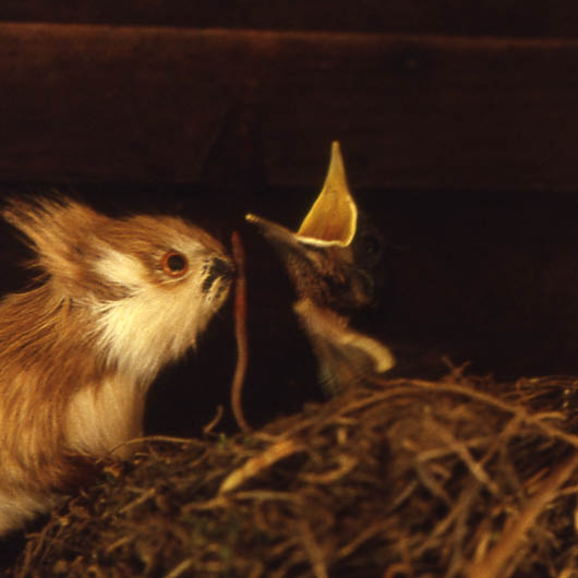 A l'intention de nos amis Hibou et Courlis du Canada, grands connaisseurs des animaux de la forêt,je tiens à signaler que tous les écureuils ne pillent pas les nids pour y manger les oeufs mais qu'en Suisse, il y en a qui se donnent la peine d'apporter des vers de terre à des jeunes merles orphelins. Désolé pour la mauvaise qualité de cette photo qui est un document exceptionnel.