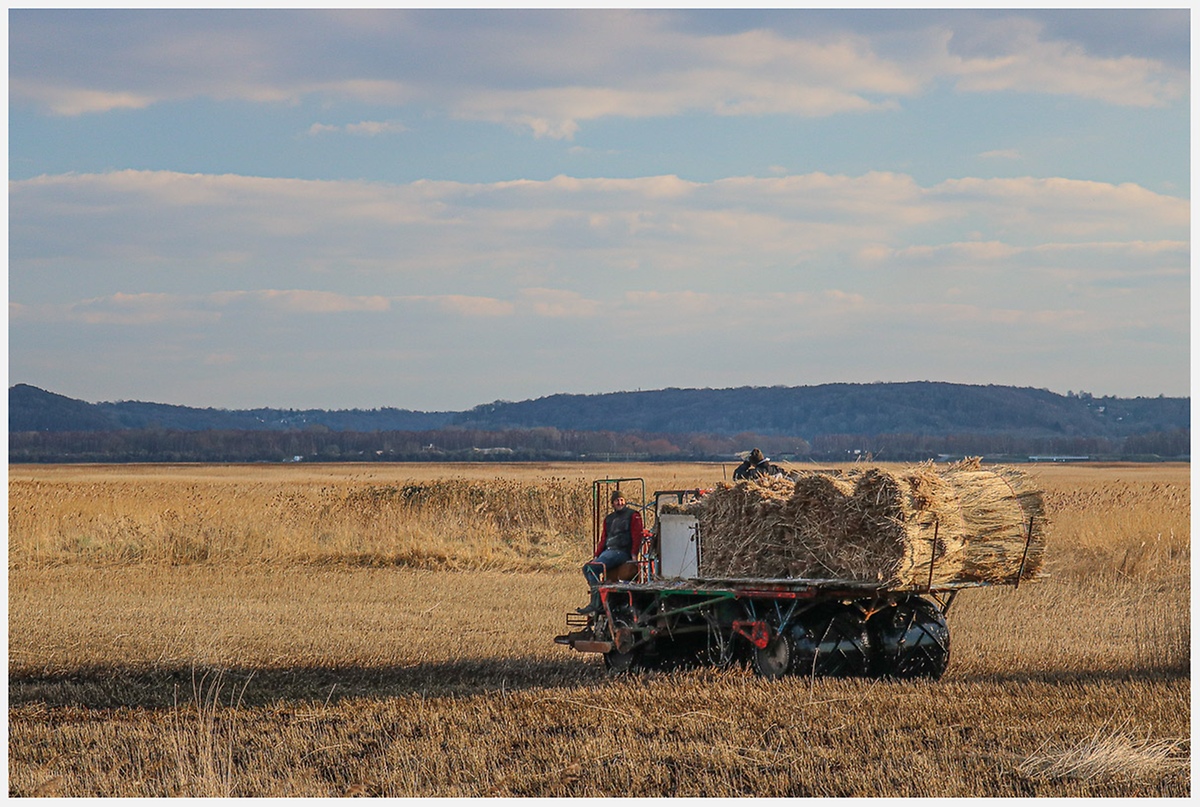 Si la photo n'a rien d'artistique, elle est en revanche très narrative et informative sur la récolte des roseaux. Pour ma part, je ne connaissais pas cet engin aux roues très adaptées aux sols humides sans doute.