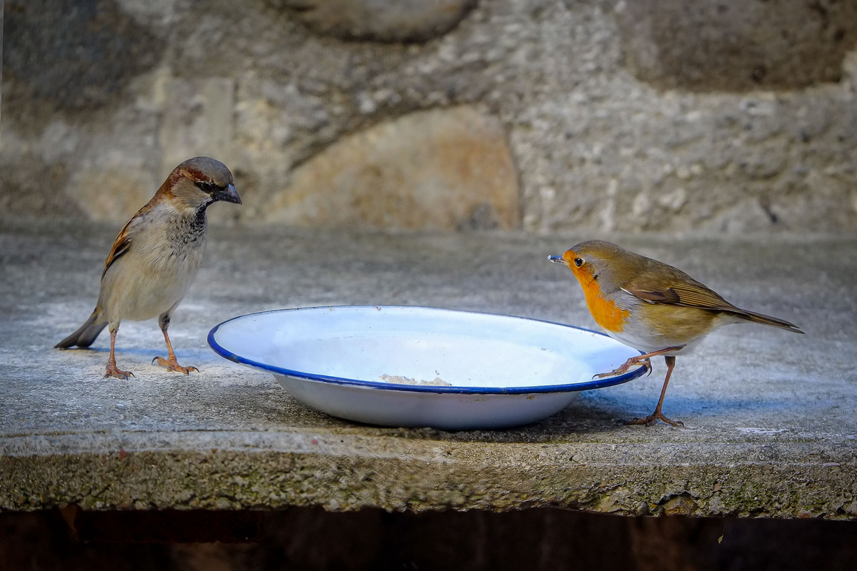 trop sympa, le rouge gorge semble inviter le moineau à partager sa gamelle..