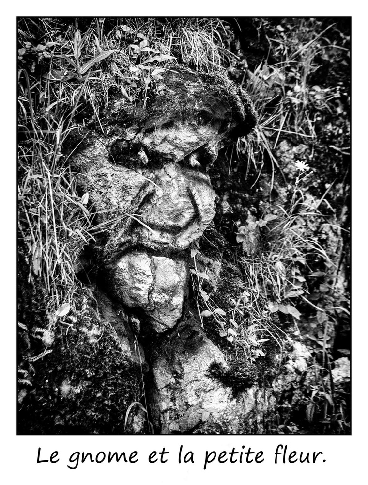Le street art est à la mode, comment appeler cela : Country art, peut-être, au hasard d'une promenade un affleurement rocheux transformé par un artiste en tête de gnome, à hauteur de ses yeux une petite fleur était venue s'égarer qu'il regardait fixement...