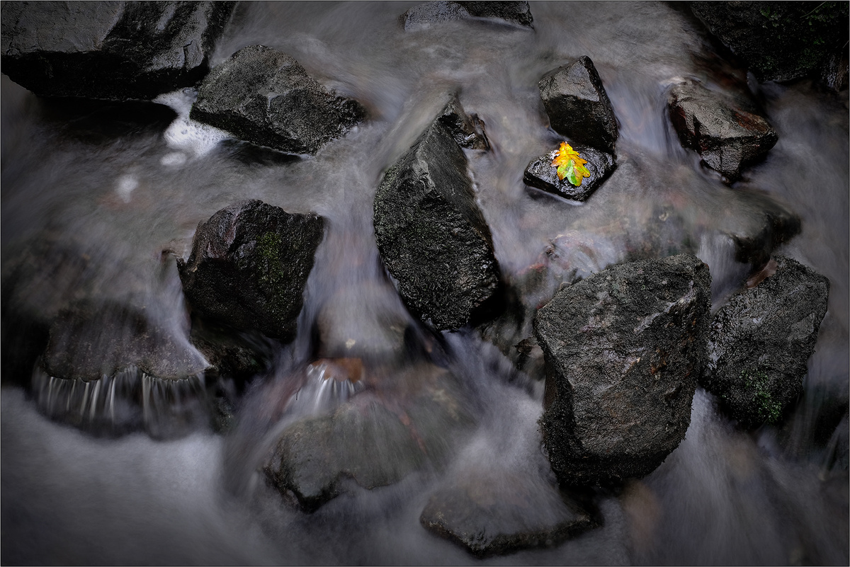 Encore un beau rendu de filé d'eau qui valorise la netteté sur ces pierres et cette feuille