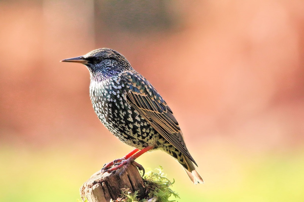 Deuxième prise de l'Etourneau avec arrière - plan en pente végétal: pelouse, haie de buissons différents et surtout un mur de magnifiques fougères.