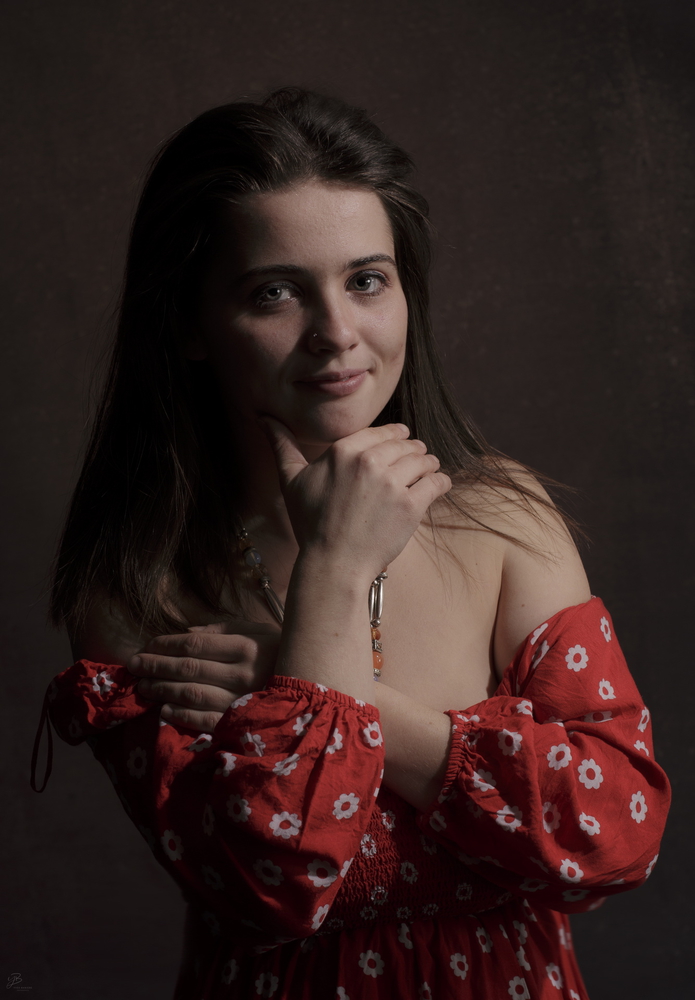 Je trouve la position des mains un peu artificielle et celle sous le menton prend un peu trop de place dans la compo pour moi...