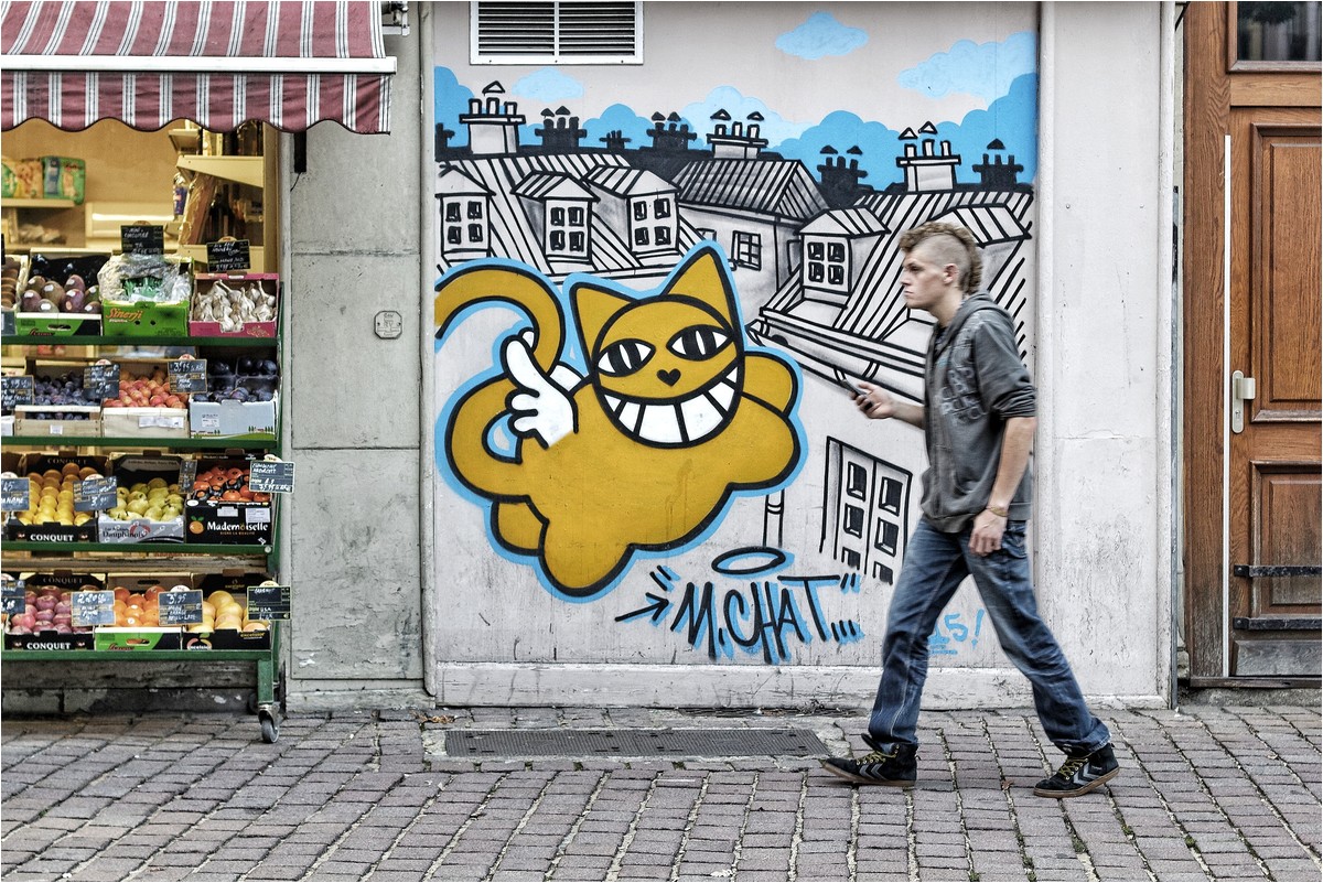 Le contraste entre l'étalage, ce jeune homme et le graf est très bien vu.