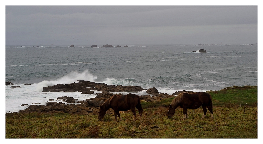 Beau paysage marin ... la mer se déchaine et les chevaux, dans leur élément, sont paisibles ...
