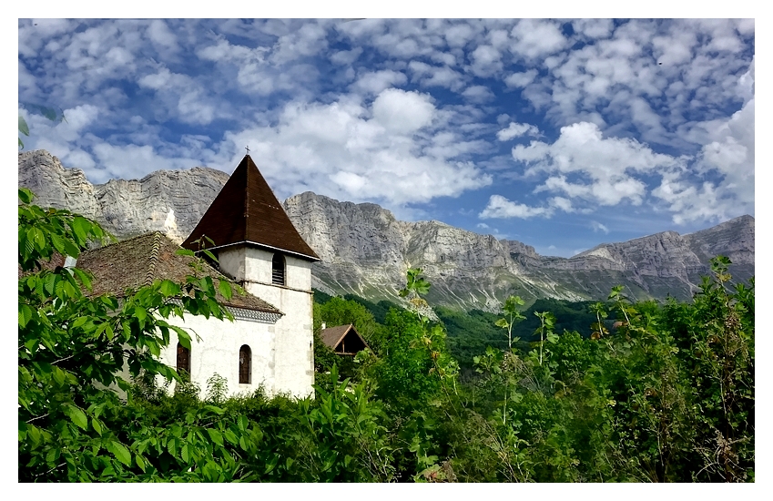 Une bien belle bâtisse avec vue sur la chaîne du Vercors bien mise en valeur. Belle composition avec ce ciel blanc moutons