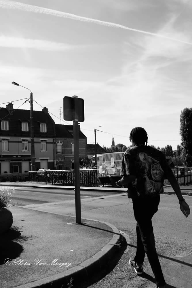 la traversée de la ville avec la cage à oiseau et le serin à l'intérieur