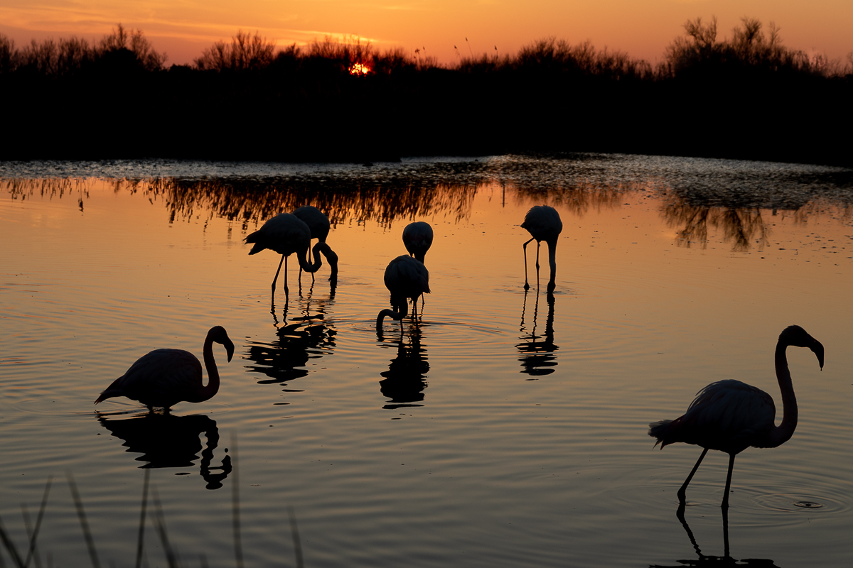 Belle ambiance nocturne. La présence sur plusieurs plans de ces flamants en ombre chinoise est superbe