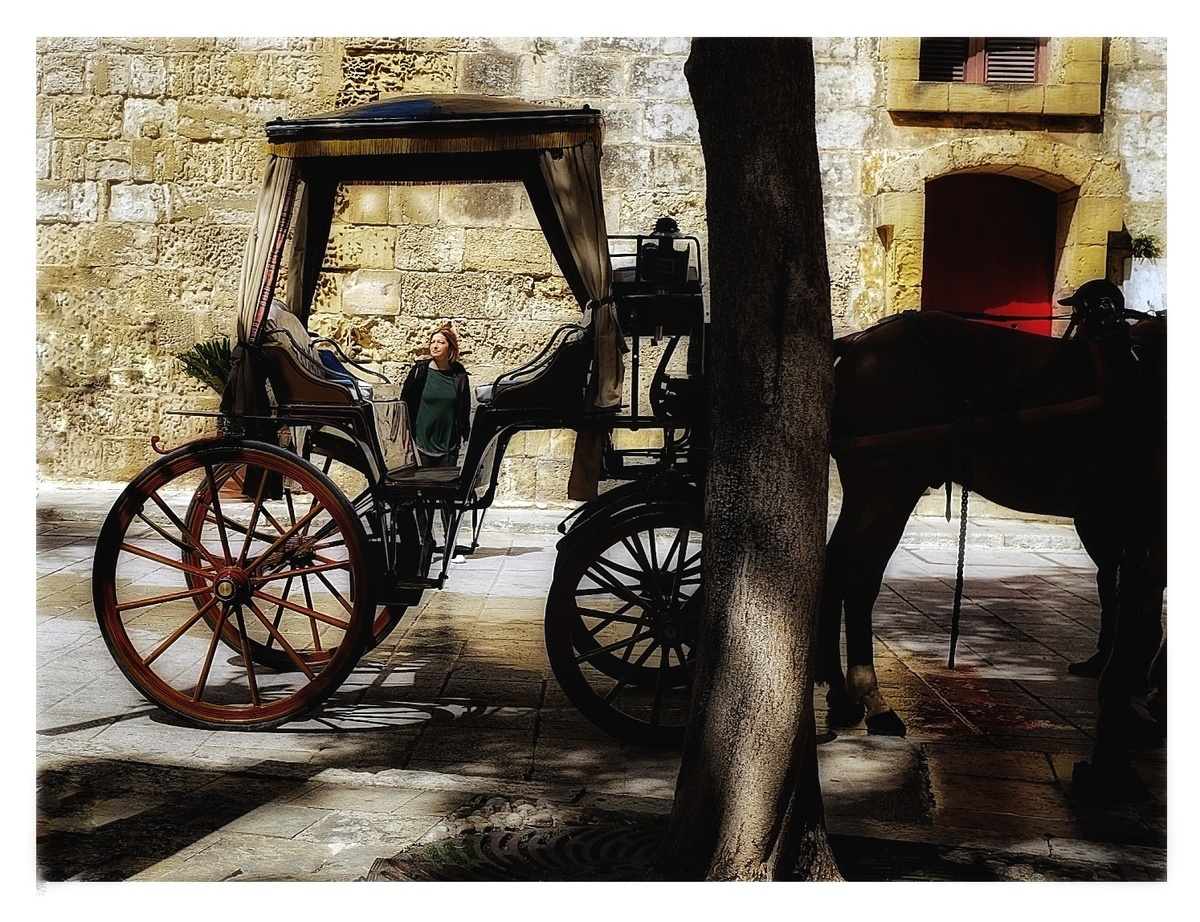 Pas fan du cadrage. Le sujet de la photo me semble être plutôt le carrosse, et il est masqué par le tronc d'arbre, que la femme, qui est en arrière plan et cachée par le chariot.