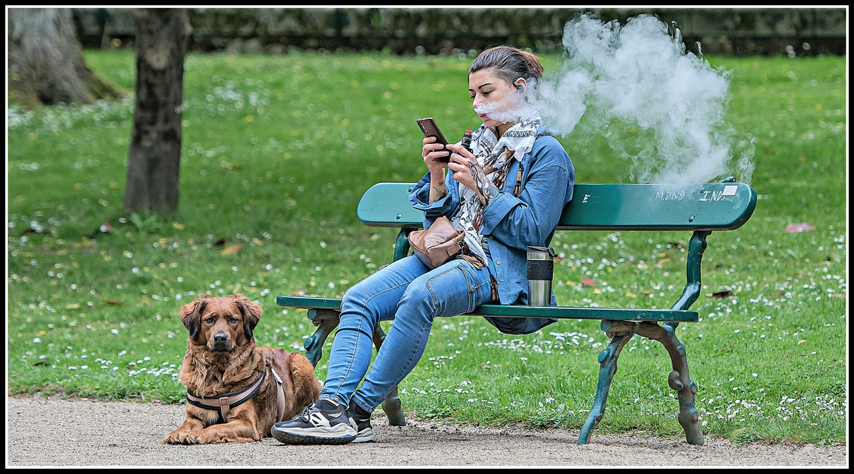 Elle vapote, elle tapote un message a l'intention d'un pote et l'auteur capte la scène en format cinémascope.