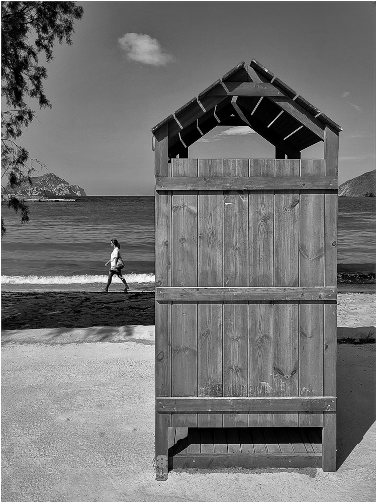 Je suis tout de suite saisi par cette photo, sans savoir totalement pourquoi : le mouvement de cette femme et l'immobilisme du premier plan, les ombres, la beauté du N&B, la composition très soignée, sans doute un peu tout cela et bien d'autres choses que je ne sais pas expliquer!