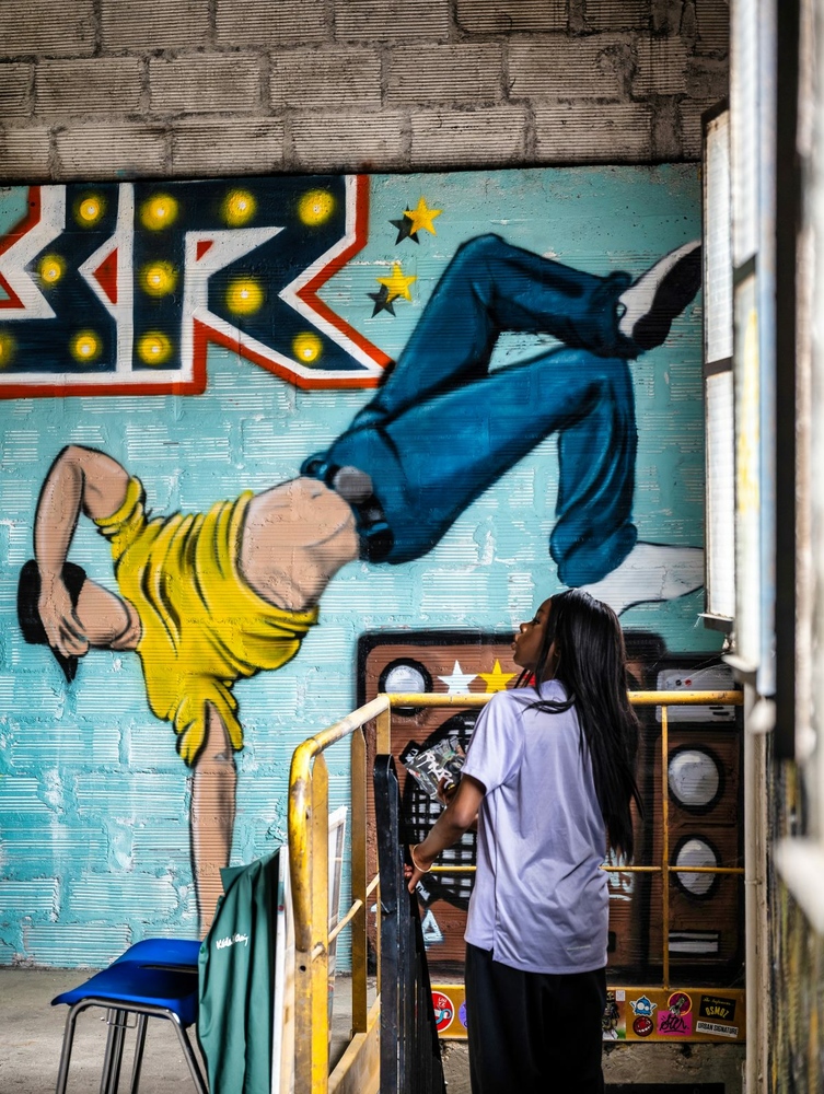 Il y a beaucoup d'éléments dans ce cadrage étroit, beaucoup de couleurs qui nous placent au cœur de cette exposition d'art de la rue.