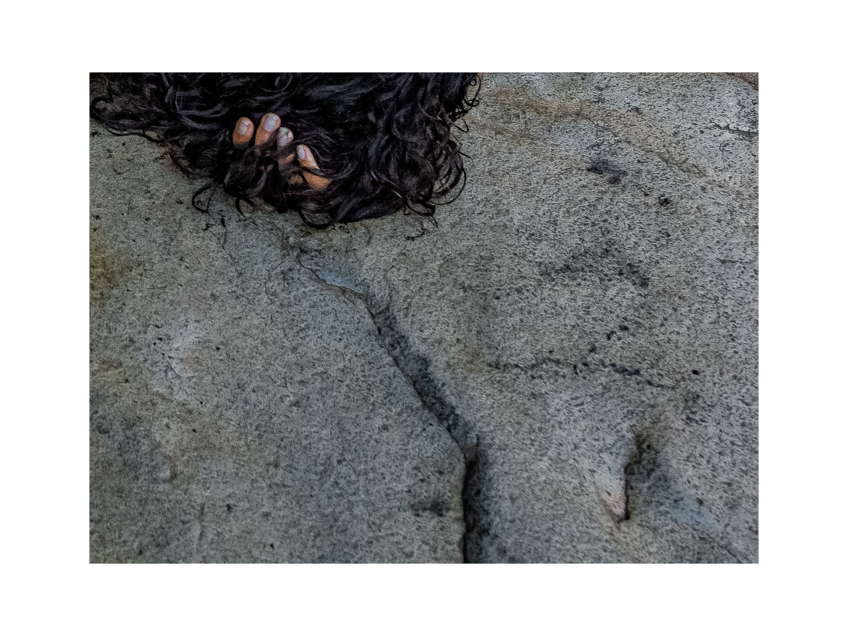 Hello, alors je vais tenter quelques mots... Cette idée des doigts qui poursuivent la fissure me plaît, de même que cette chevelure, ondulations et fissures de la roche. Il y a une histoire, c'est sûr, cependant, j'ai du mal à me la raconter car un tout petit peu trop peu d'éléments ou trop coupés.Une sorte de supplication cette posture? Pour moi bien évidemment. De plus cette PDC me gêne un peu car je me focalise sur le premier plan. Et le cadre trop imposant également qui m'empêche d'entrer en contact, comme dit déjà sur la photo du visage de la dame dans l'eau je crois... Peut-être as-tu d'autres photos de cette scène?