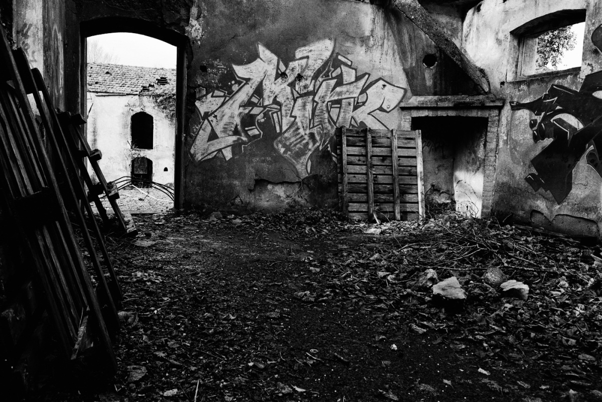 La première version plus sombre convient mieux au sujet, la composition est équilibrée avec les deux ouvertures de part et d'autres du graffiti au centre de l'image.