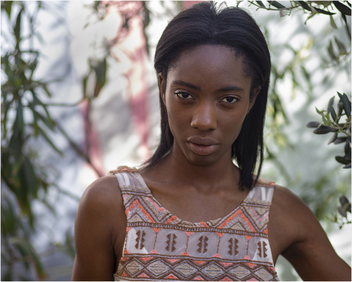 J'aime beaucoup ce bokeh graphique et coloré qui met en valeur la modèle ainsi que son expression sérieuse qui semble contredire la gaieté du moment .