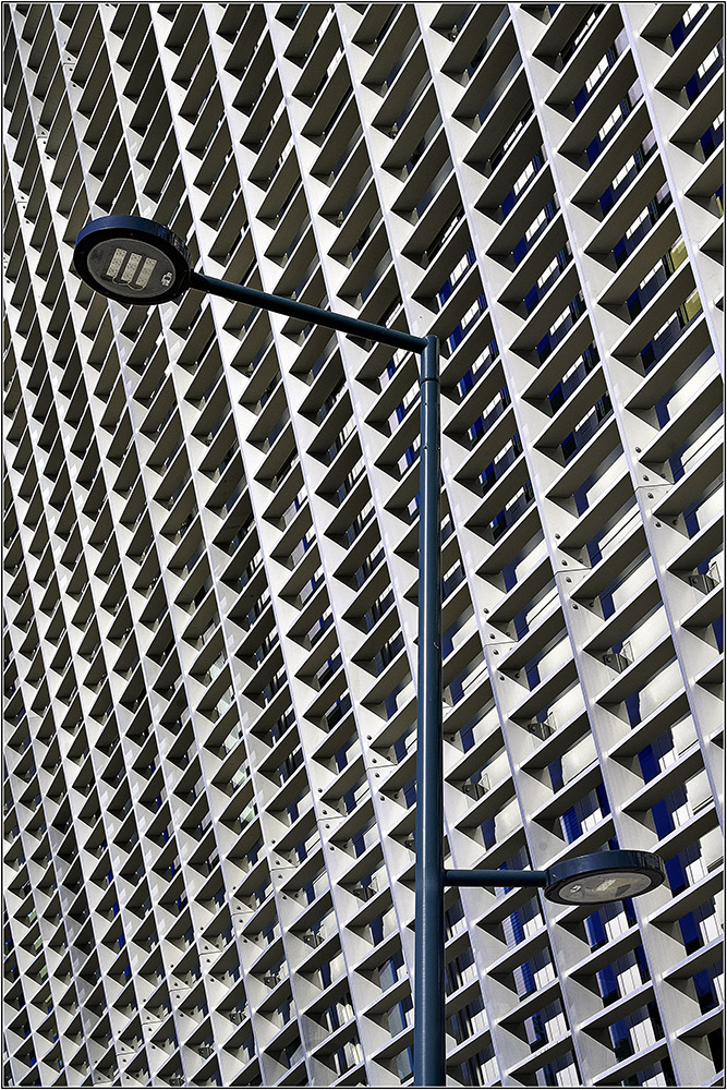 Très visuel, les lignes des balcons semblent se refléter dans le lampadaire.