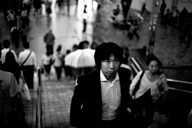 C'est vrai que l'espoir n'illumine pas le visage de cet homme. Une grande tristesse ressort de cette photo et elle vient du traitement de la femme en arrière plan les silhouettes floues quasi fantomatiques derrière ... Une tristesse mélées de résignation. Un des aspects du Japon ressort bien ici, une ambiance que l'on retrouve dans certaines productions ciné asiatiques.