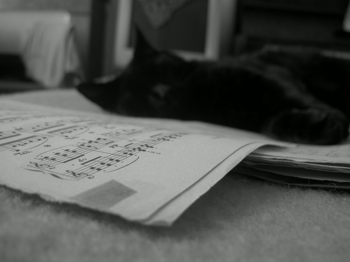 Idée super le chat sur la partition on dirait qu'il s'endort en écoutant la musique ... Le résultat est (amha) pas très réussi la faute à la dominance du flou et au peu de notes qui restent nettes donc à lire ... La "zone de lecture" est trop réduite et cela vient aussi du fait que la partition occupe la gauche de l'image ...