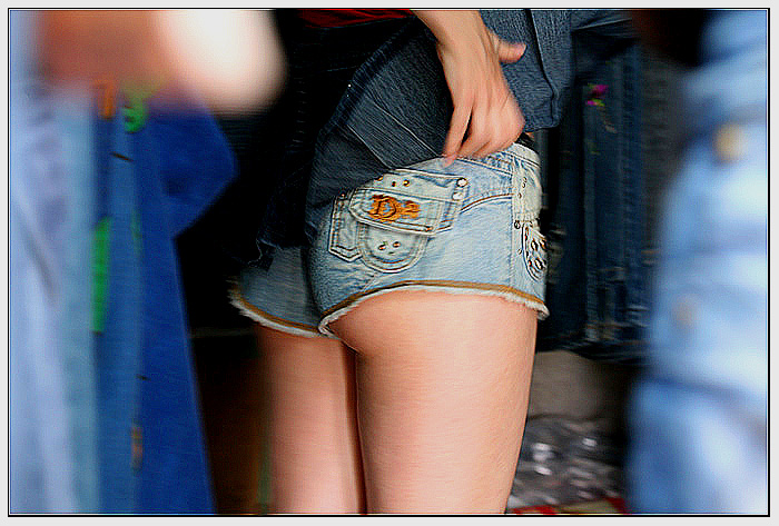 La demoiselle à l'air d'essayer une jupe jean's par dessus son short...