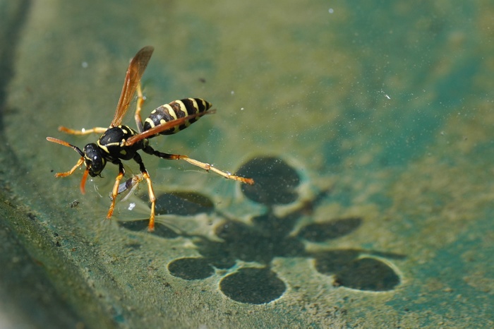 une guèpe posée sur l'eau avec une ombre qui ressemble plus a une fleur qu'a un insecte...très originale