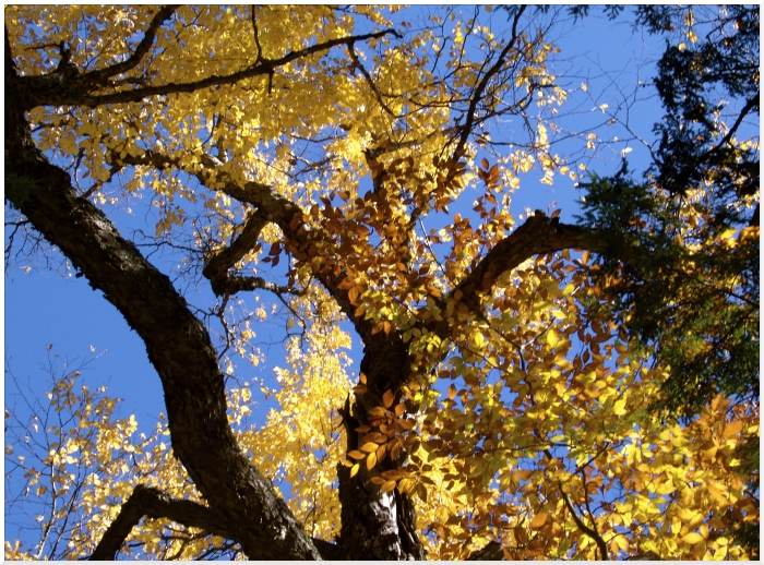Vieux bouleau jaune (Betula alleghaniensis) de > 200 ans aux feuilles jaunes or ! En bas à droite des feuilles plus grandes (hêtre à grandes feuilles, Fagus grandifolia) jaunes-orangées et enfin sur le flanc droit un rameau de Pruche de l'Est (Tsuga canadensis), compagnon fidèle du bouleau jaune...