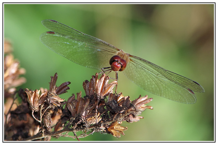 Ce Sympétrum tardif photographié en ce bel après-midi du 22 octobre 2007 en est la preuve. Difficile de trouver un rapport avec le thème hormis son museau rose.