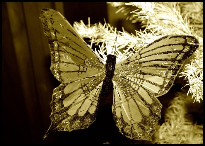 pour corriger les branches de sapins cramées, utilise un éclairage d'appoint ou un flash avec un diffuseur pour éclairer le papillon, garde la même ouverture pour limiter la PDC, ton temps d'exposition sera plus court donc l'éclairage du sapin moins visible et ton fond sera complètement noir (donc plus d'entourage de porte). Et pour le cadrage : coupe la partie gauche qui ne sert à rien.