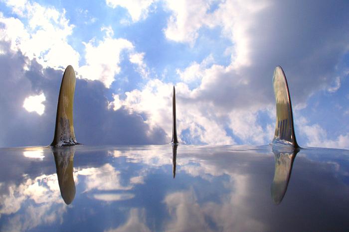 Une planche à voile ou un surf retourné i presume ?... des ailerons de requin dans une mer d'huile... Ici, peut-être un dégradé gris sur le haut pour rééquilibrer le ciel et son reflet sur la planche, hormis cela, rien à dire...(un régal ton site)