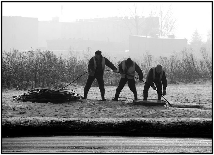 Elle a quelque chose d'amusant cette photo alors que ces hommes ne doivent pas se marrer! On sent le froid du petit matin.
