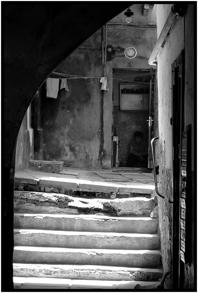Hop, voila aussi un moment volé...je ne me suis rendu compte de la présence du personnage qu'au moment de prendre la photo et de cadrer, la lumière des marches me masquant la petite pièce au fond...