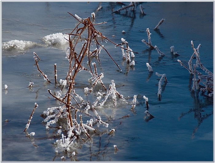 Volis de cerisier de Pennsylvanie pris dans la glace d'un ruisseau au Marais Léon Provencher (Neuville, Québec, 24 mars 2008; température -17 °C)