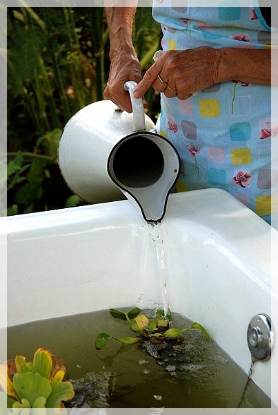 je l'ai essayé en noir et blanc car j'aime bien l'idée de cette photo avec ce vieux broc et les mains de ta mère...