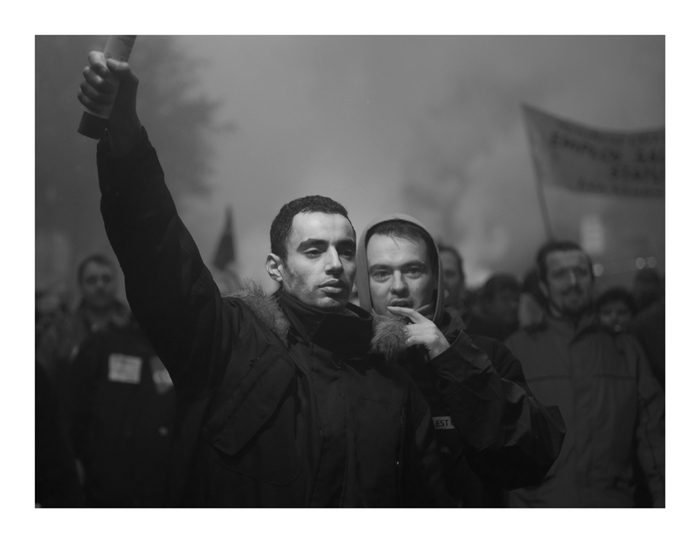 j'aime la détermination vissée sur la figure de monsieur 'poing levé'. j'aime le focus sur ces deux gars avec les autres qu'ont sent nombreux derrière. et pi j'aime le traitement...