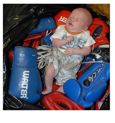 Sinon, une lumière un peu directe qui génère quelques reflets sur les gants et le short, et sur le visage du bébé...Le coin supérieur droit est à harmoniser avec les autres...Accentuer les contrastes un poil... Il faudrait revoir aussi la mise en scène...Peut-être à élargir le plan pour avoir le contexte ...
