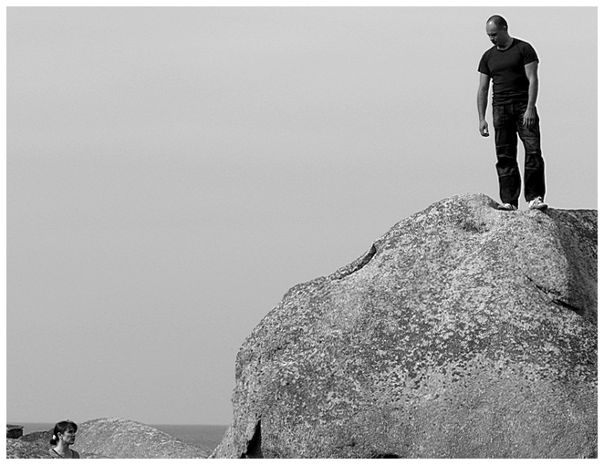 avec le n&b elle se confond avec le rocher, et pi elle est décapitée!!! mr lui est écrasé par le cadre. pour moi cadrage à revoir... la diagonale était tentante.
