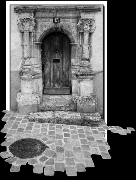 j'aime assez l'idée de la porte avec le chemin qui y mène "hors cadre", mais y'a un truc qui me gêne (le cadre blanc? les petits bouts à droite?)...