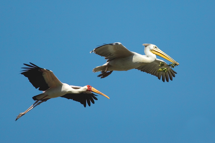 Duo en vol d'un pélican et d'un tantale ibis ( famille des cigognes ) en période de nidification en Tanzanie.