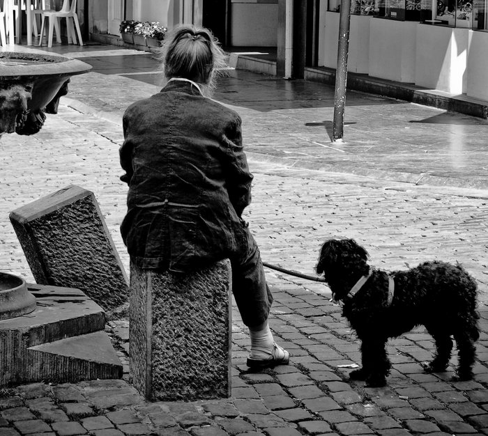 Je trouve que la photo ne met pas assez en évidence l'exclusion. Est-ce pour un resto qui interdisent les chiens, ou une personne qui n'a plus que son chien et le ciel pour vivre ?