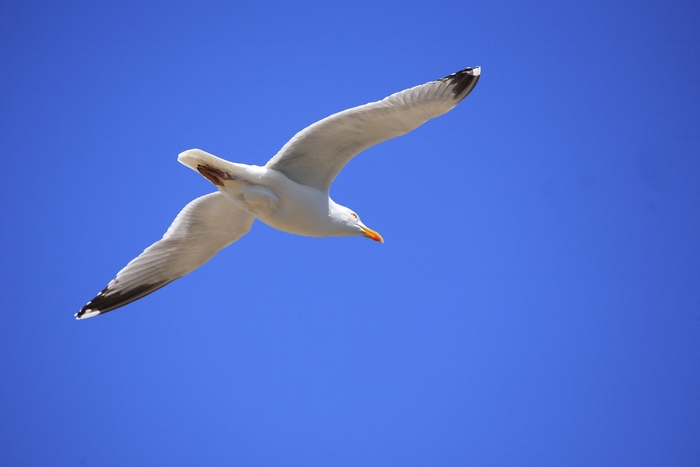 une bonne nétteté du goelan, qui ce dettache bien sur ce ciel bleu,le cadrage avec le corps dans les diagonales va bien