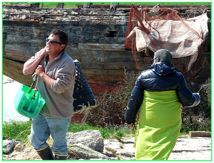 ici en l'occurrence c'est Isabelle Nanti (calfeutré car elle n'a pas l'habitude du climat breton surement) et un pêcheur qui doit porter ses casiers car il ne peut plus rapprocher sa voiture de son bateau à cause du tournage du film "king guillaume"