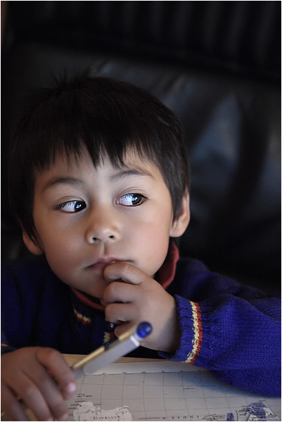 Rien à redire sur cette photo superbe sinon que j'aurais coupé un peu en haut de l'image, juste un peu au-dessus du crâne de l'enfant et cadré un peu plus bas sur la carte de géo.