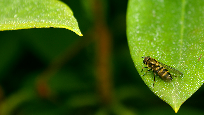 la syrphe est toute perdue dans ce végétal qui ne présente pas d'attrait particulier. c'est elle qu'il faut mettre en valeur!