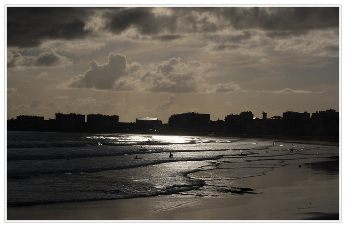 J'ai l'impression que cela penche un poil sur la droite... J'aurais essayer de resserer sur le reflet à la prise de vue... les surfer sont un poil discret pour accompagner le titre... Belles matières sur l'eau et le sable....