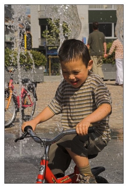 Encore une belle photo de jeu d'eau. J'avoue que j'accroche moins que celle avec la petite fille qui rigole. Question cadrage, pas doué mais je me demande si j'aurais gardé autant d'espace en haut...