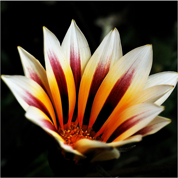 Magnifique cliché des couleurs splendides mais elle pousse le cadre ou c'est le cadre qui pousse la fleur à se fermer légèrement .